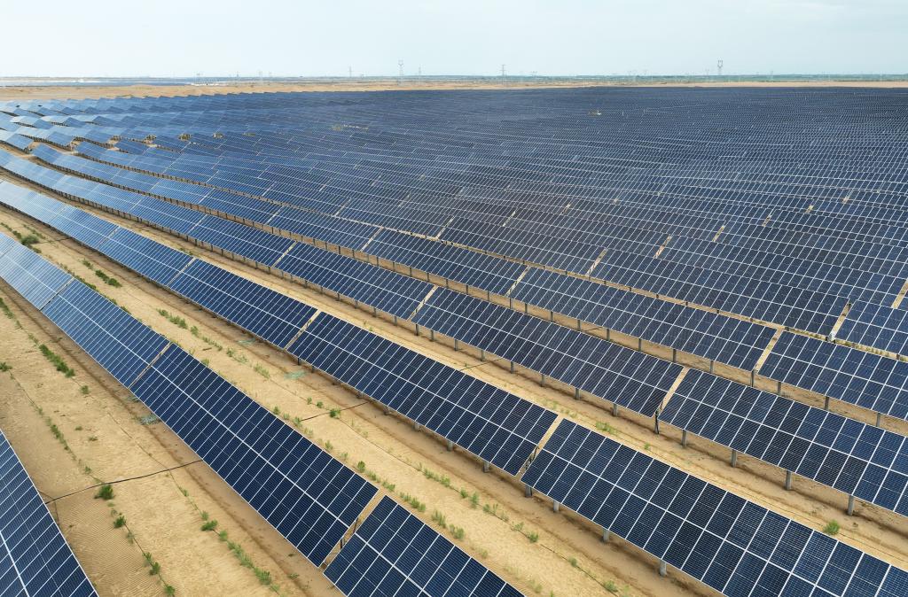 這是7月5日拍攝的內(nèi)蒙古烏蘭布和沙漠防沙治沙和風(fēng)電光伏一體化項(xiàng)目區(qū)(無人機(jī)拍攝)。新華社記者 李云平 攝