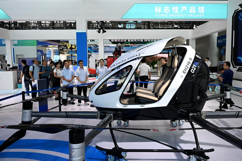 9月20日,在2024世界制造業(yè)大會上,人們了解一款載人級無人駕駛電動垂直起降航空器。新華社記者 黃博涵 攝