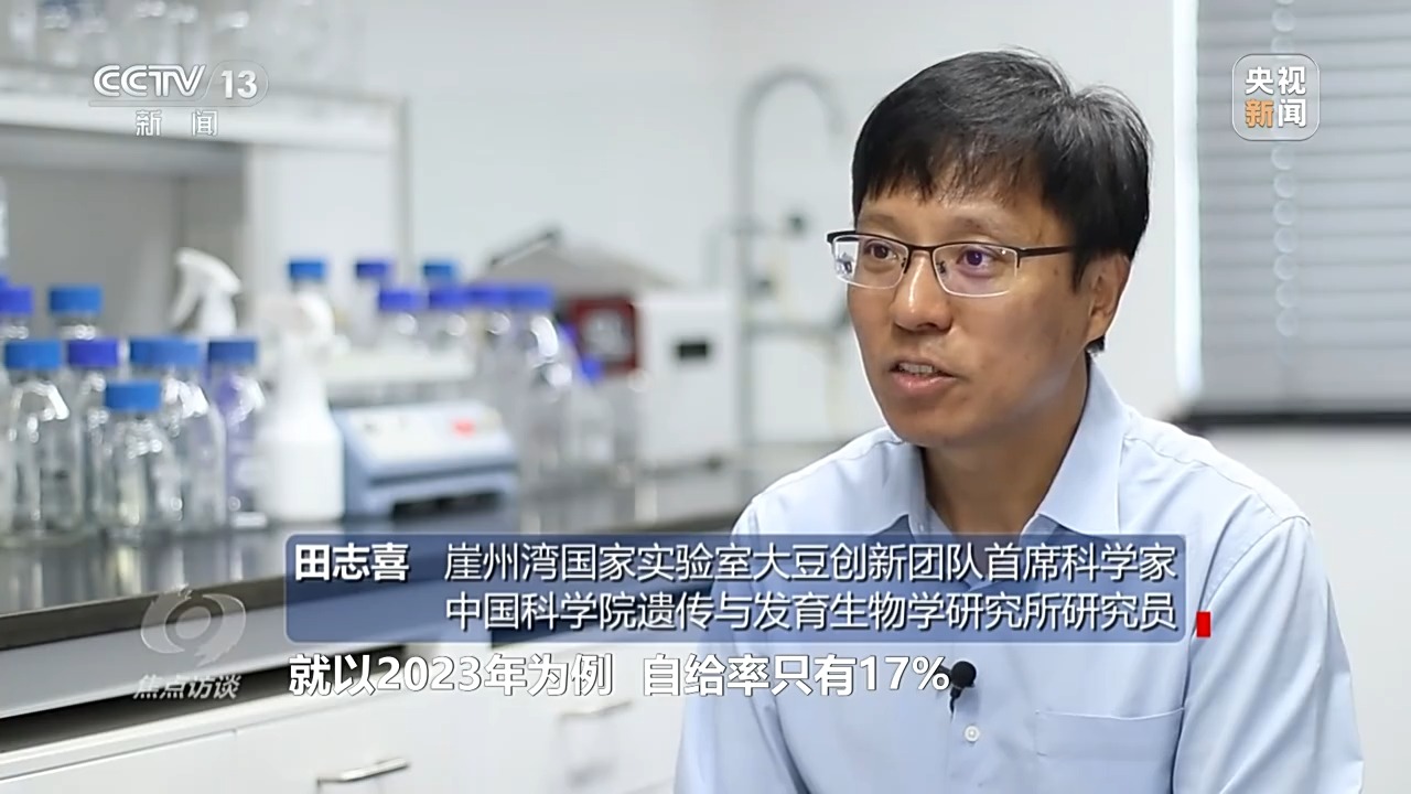 崖州灣國家實(shí)驗(yàn)室大豆創(chuàng)新團(tuán)隊(duì)首席科學(xué)家、中國科學(xué)院遺傳與發(fā)育生物學(xué)研究所研究員 田志喜:中國大豆的自給率太低了,以2023年為例,只有17%,在這種情況下,保證我們糧食安全,大豆義不容辭、責(zé)無旁貸,提高它的自給率。