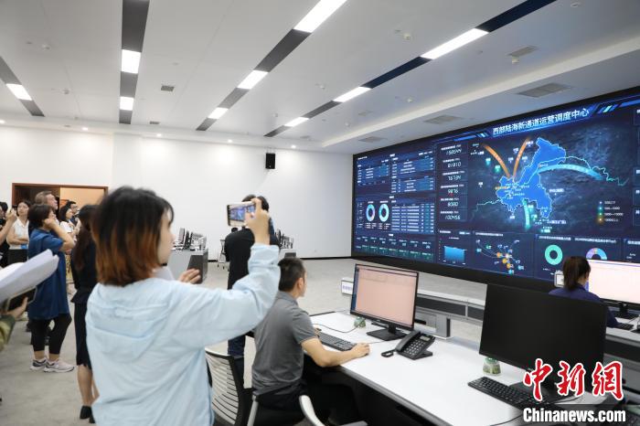 圖為采訪團(tuán)成員走訪西部陸海新通道運(yùn)營(yíng)調(diào)度中心。梁欽卿 攝