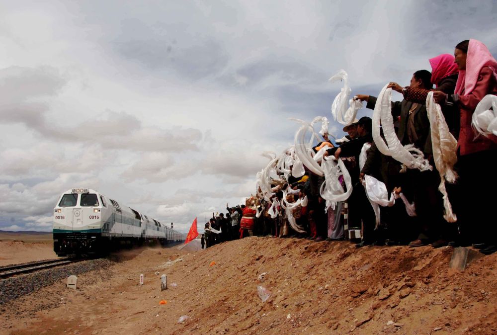2006年7月1日,青藏鐵路全線通車。在青海沱沱河大橋橋頭,當(dāng)?shù)厝罕姎g迎從格爾木出發(fā)的“青1”次列車。新華社記者 陳燮 攝