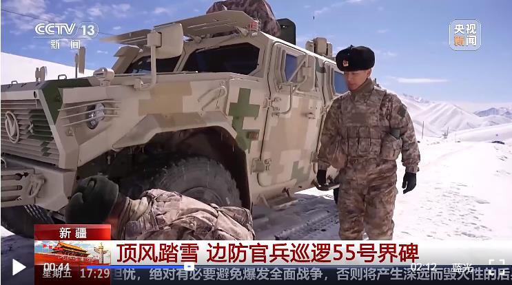 新疆 頂風(fēng)踏雪 邊防官兵巡邏55號(hào)界碑