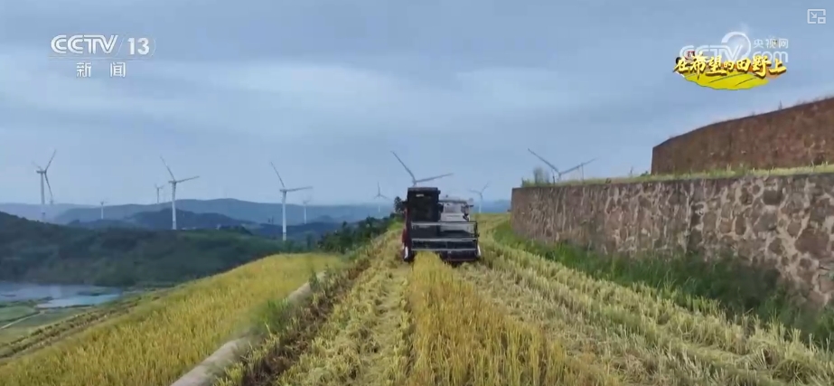 從空中俯瞰,層層疊疊的稻田在陽光的照耀下,如同一幅精美的畫卷。伴隨著收割機的轟鳴聲,一束束金黃的稻穗被收入囊中。