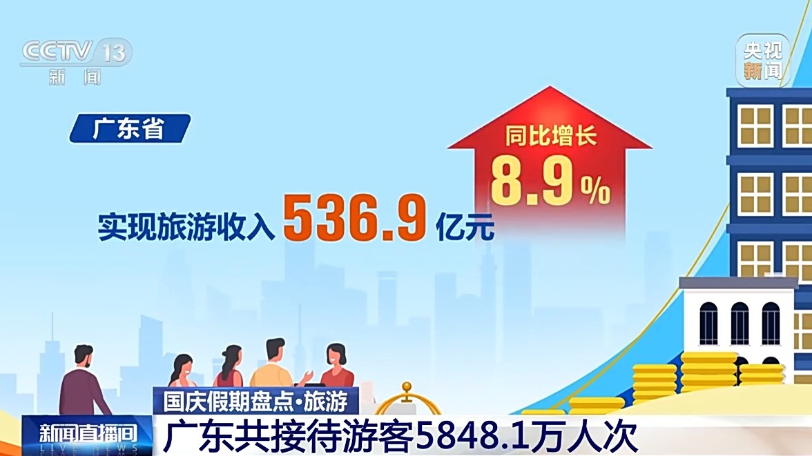 廣東省10月1日至7日累計(jì)接待游客5848.1萬人次,按可比口徑同比增長(zhǎng)6.2%;實(shí)現(xiàn)旅游收入536.9億元,同比增長(zhǎng)8.9%。古驛道沿線重點(diǎn)區(qū)域、紅色旅游經(jīng)典景區(qū)、鄉(xiāng)村旅游點(diǎn)和歷史古村落等,成為旅游出行熱點(diǎn)。