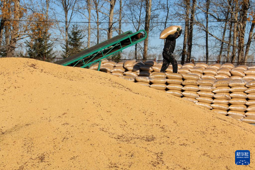 10月3日,在北大荒集團黑龍江五大連池農(nóng)場有限公司第一作業(yè)區(qū)糧食晾曬場,種植戶在堆放大豆。新華社發(fā)(陸文祥攝)