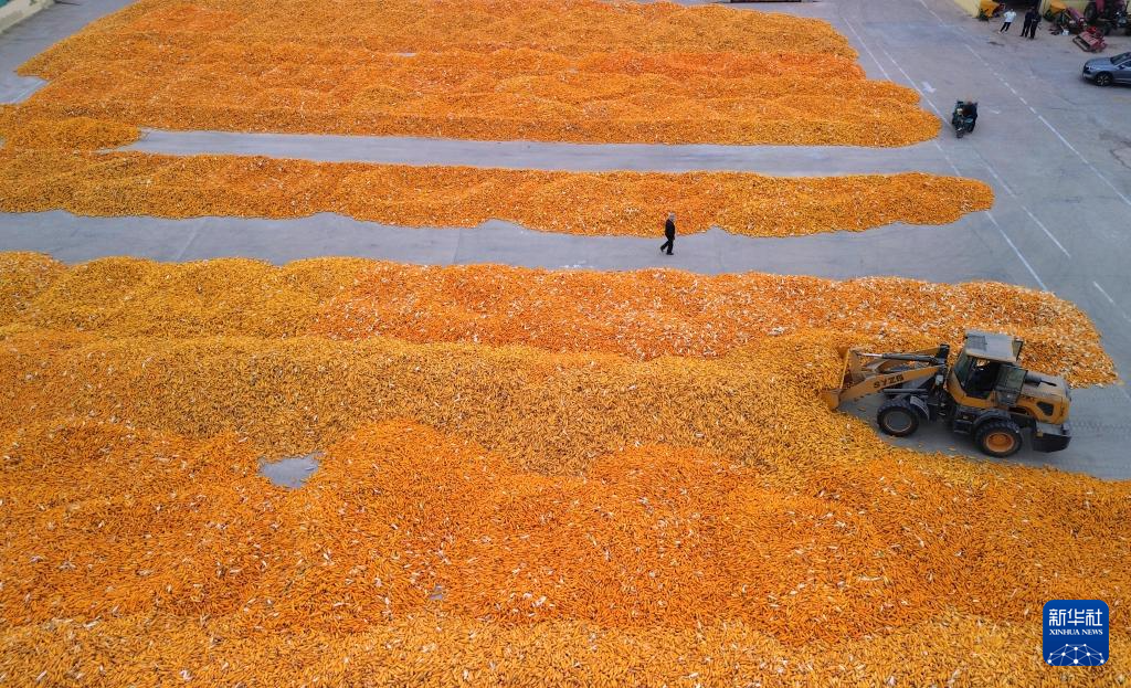 10月9日,在山東省臨邑縣德平鎮(zhèn),農(nóng)戶在晾曬剛收獲的玉米(無人機照片)。新華社記者 徐速繪 攝