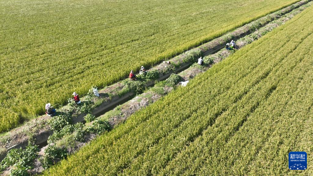 10月4日,江蘇省淮安市洪澤區(qū)農(nóng)民在采摘毛豆(無人機照片)。新華社發(fā)(萬震攝)