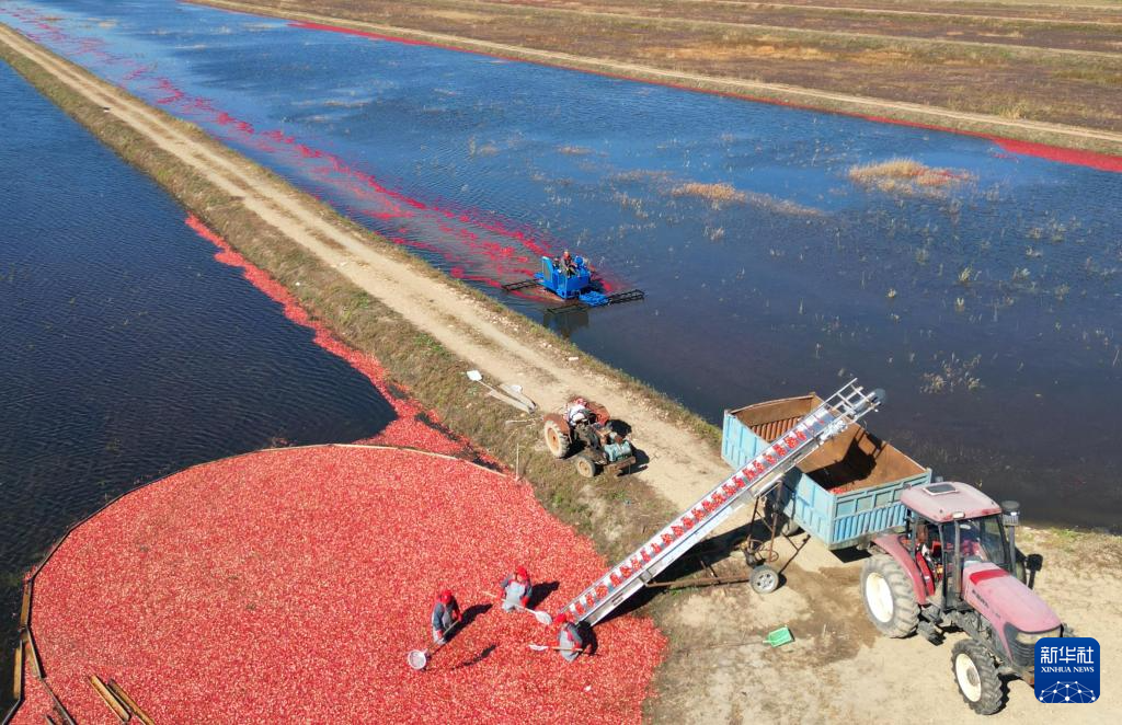 10月4日,在黑龍江省撫遠(yuǎn)市蔓越莓種植基地,工人在水中采收蔓越莓(無人機照片)。新華社發(fā)(李擁軍攝)