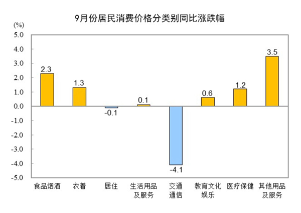 9月份,全國居民消費價格環(huán)比持平。其中,城市下降0.1%,農(nóng)村上漲0.1%;食品價格上漲0.8%,非食品價格下降0.2%;消費品價格上漲0.2%,服務價格下降0.3%。