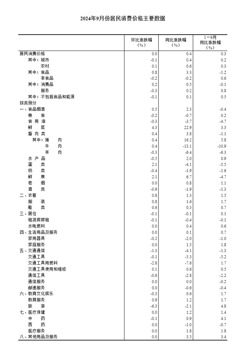 2024年9月份,全國居民消費價格同比上漲0.4%。其中,城市上漲0.4%,農(nóng)村上漲0.6%;食品價格上漲3.3%,非食品價格下降0.2%;消費品價格上漲0.5%,服務價格上漲0.2%。1—9月平均,全國居民消費價格比上年同期上漲0.3%。