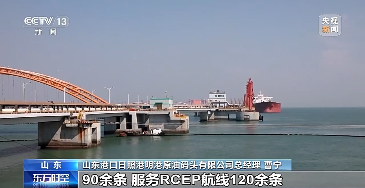 山東港口日照港明港原油碼頭有限公司總經(jīng)理 曹寧:目前有面向共建“一帶一路”國家航線90余條、服務(wù)RCEP航線120余條,為我國北方貿(mào)易通達(dá)全球提供重要助力。