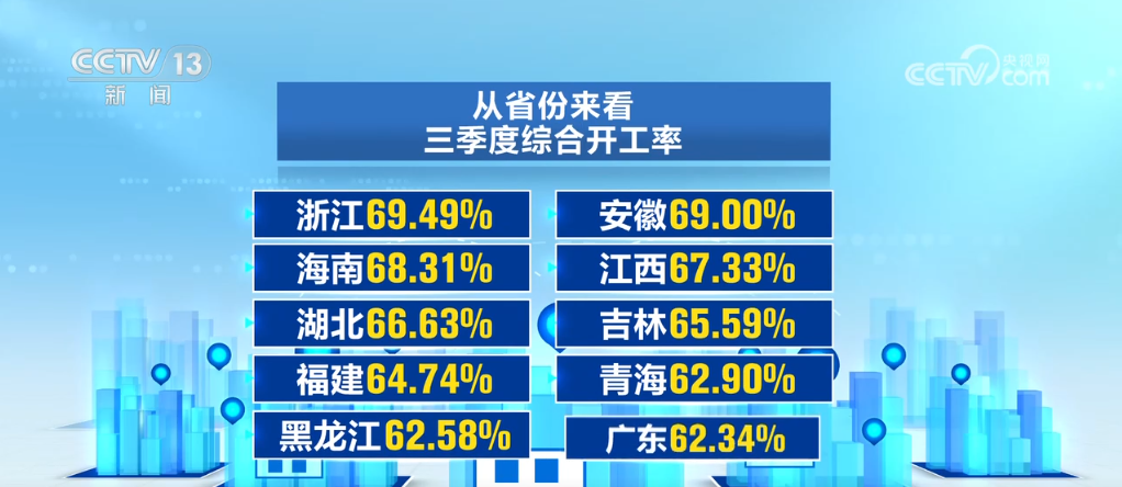從省份來看,三季度綜合開工率排名前十的有浙江、安徽、海南等,且開工率都在60%以上,工程建設熱情高漲。