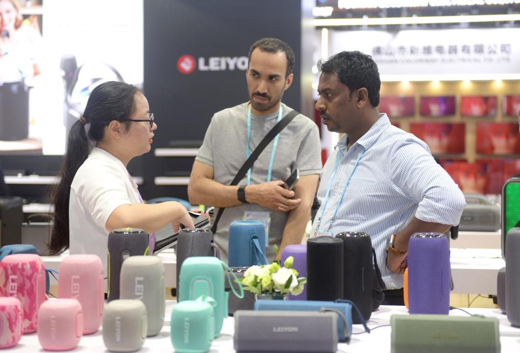 10月15日,客商在廣交會(huì)展館內(nèi)參觀選購(gòu)音箱。新華社記者盧漢欣 攝