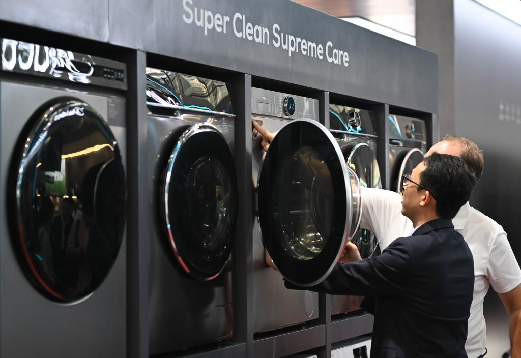 10月15日,境外采購(gòu)商觀看參展企業(yè)家電產(chǎn)品。新華社記者鄧華 攝