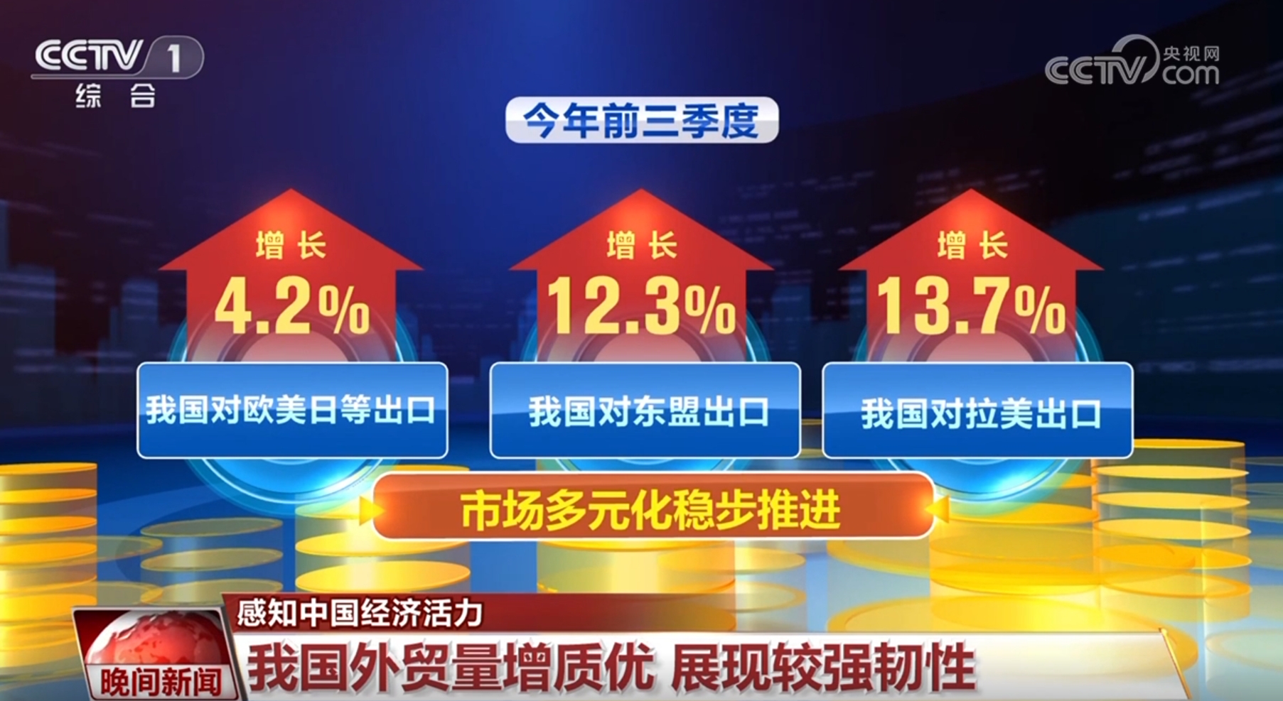 今年以來(lái),我國(guó)外貿(mào)量增質(zhì)優(yōu),展現(xiàn)較強(qiáng)韌性。世貿(mào)組織最新數(shù)據(jù)顯示:上半年我國(guó)出口國(guó)際市場(chǎng)份額為14.3%,同比提高0.4個(gè)百分點(diǎn)。前三季度,我國(guó)與160多個(gè)國(guó)家和地區(qū)貿(mào)易實(shí)現(xiàn)增長(zhǎng),對(duì)歐美日等傳統(tǒng)市場(chǎng)出口增長(zhǎng)了4.2%,對(duì)東盟、拉美等新興市場(chǎng)出口分別增長(zhǎng)了12.3%和13.7%,市場(chǎng)多元化穩(wěn)步推進(jìn)。在深圳鹽田港,僅今年前9個(gè)月就新增了16條航線(xiàn)。