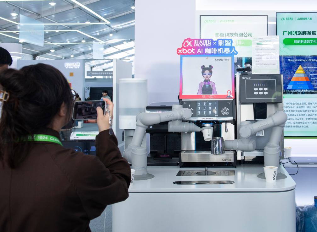在第七屆世界聲博會(huì)上展出的AI咖啡機(jī)器人。新華社記者 傅天 攝