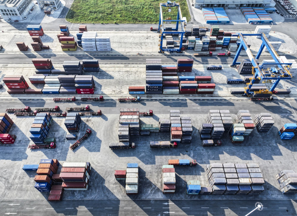 10月28日,轉(zhuǎn)運(yùn)卡車(chē)在陸海新通道重慶無(wú)水港來(lái)往穿梭(無(wú)人機(jī)照片)。