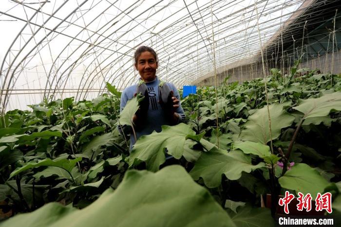 阿孜古麗·薩依提在溫棚里采摘蔬菜。陶拴科 攝
