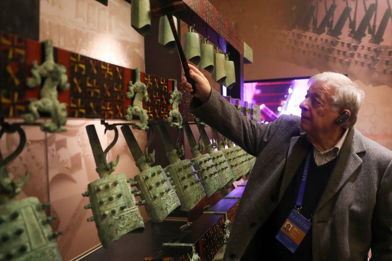 2024年11月6日,北京,專家學(xué)者在中國(guó)考古博物館體驗(yàn)編鐘。張祥毅 攝