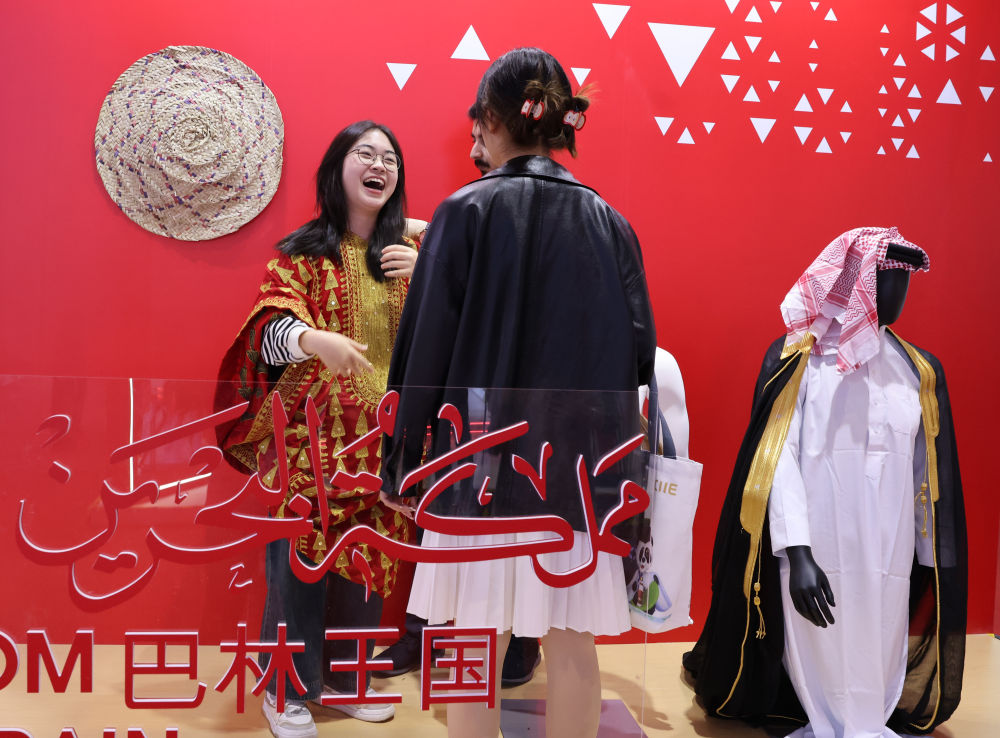 11月5日,參會(huì)者在第七屆進(jìn)博會(huì)國家展巴林館試穿巴林服裝。新華社記者 殷剛 攝