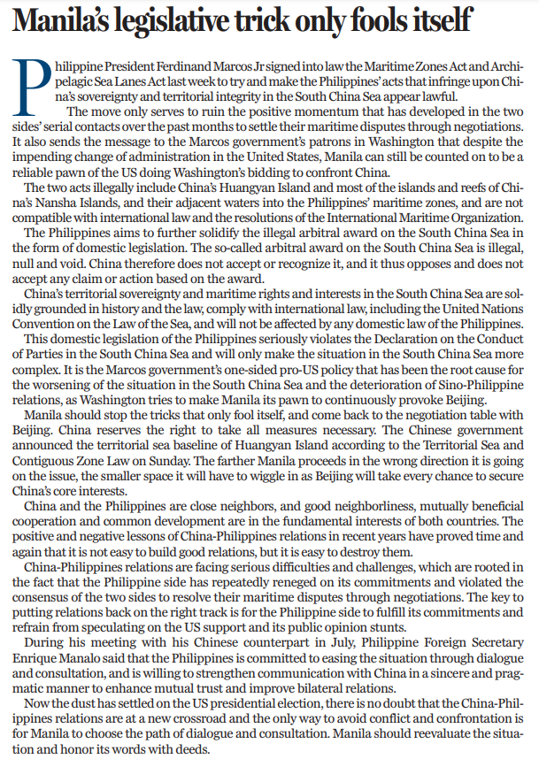 菲律賓總統(tǒng)馬科斯日前簽署“群島海道法”和“海洋區(qū)域法”,試圖“洗白”菲律賓在南海侵犯中國主權(quán)和領(lǐng)土完整的行為。