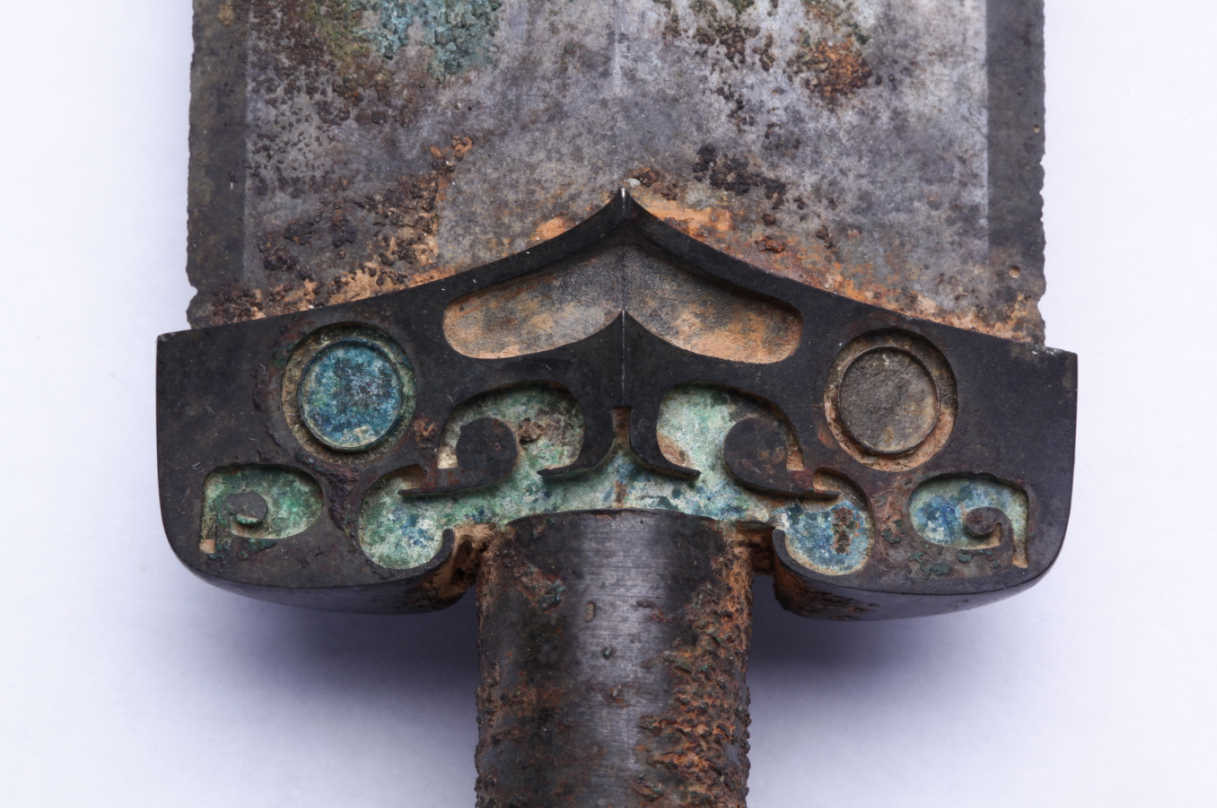 這把青銅劍通長(zhǎng)58.3厘米,劍身寬大厚重,在前部有一個(gè)明顯變窄,可以提高劍的刺穿能力,劍尖雖然只有極尖銳的一點(diǎn),但不可思議的是,在高倍放大鏡下仍然可以看出有六至八個(gè)截面。劍身雖然光素,仔細(xì)觀察會(huì)發(fā)現(xiàn)寶劍通體泛著幽幽的神秘藍(lán)光,劍格上鑄出獸面紋,鑲嵌的綠松石有一面已經(jīng)脫落,劍身近格處鑄有兩行銘文:“攻敔(吳)王夫差自乍(作)其元用”,表明這把劍的擁有者是吳國(guó)歷史上大名鼎鼎的吳王夫差。