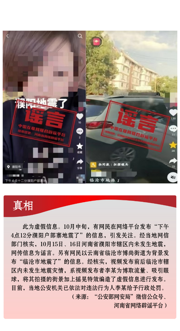 危言聳聽炒作話題。個別網(wǎng)民和自媒體編造虛假信息,炒作社會熱點話題,并配以具有煽動性、誤導性的標題,擴散傳播,擾亂社會秩序。10月中旬,新疆喀什、阿克蘇地區(qū)相繼發(fā)生地震,部分自媒體罔顧事實,利用AI技術拼湊網(wǎng)絡舊圖,編造完全與事實不符的地震廢墟或災后救援圖片,混淆視聽,嚴重誤導網(wǎng)民。另有個別網(wǎng)民將拍攝的街景加上搖晃特效,惡意杜撰云南發(fā)生地震,引發(fā)公眾恐慌,造成不良影響。還有網(wǎng)民為給網(wǎng)店營銷引流,利用家長們高度關注兒童安全話題的心理,無中生有編造“四川巴中頻繁有青少年失蹤”謠言,引發(fā)公眾焦慮恐慌。
