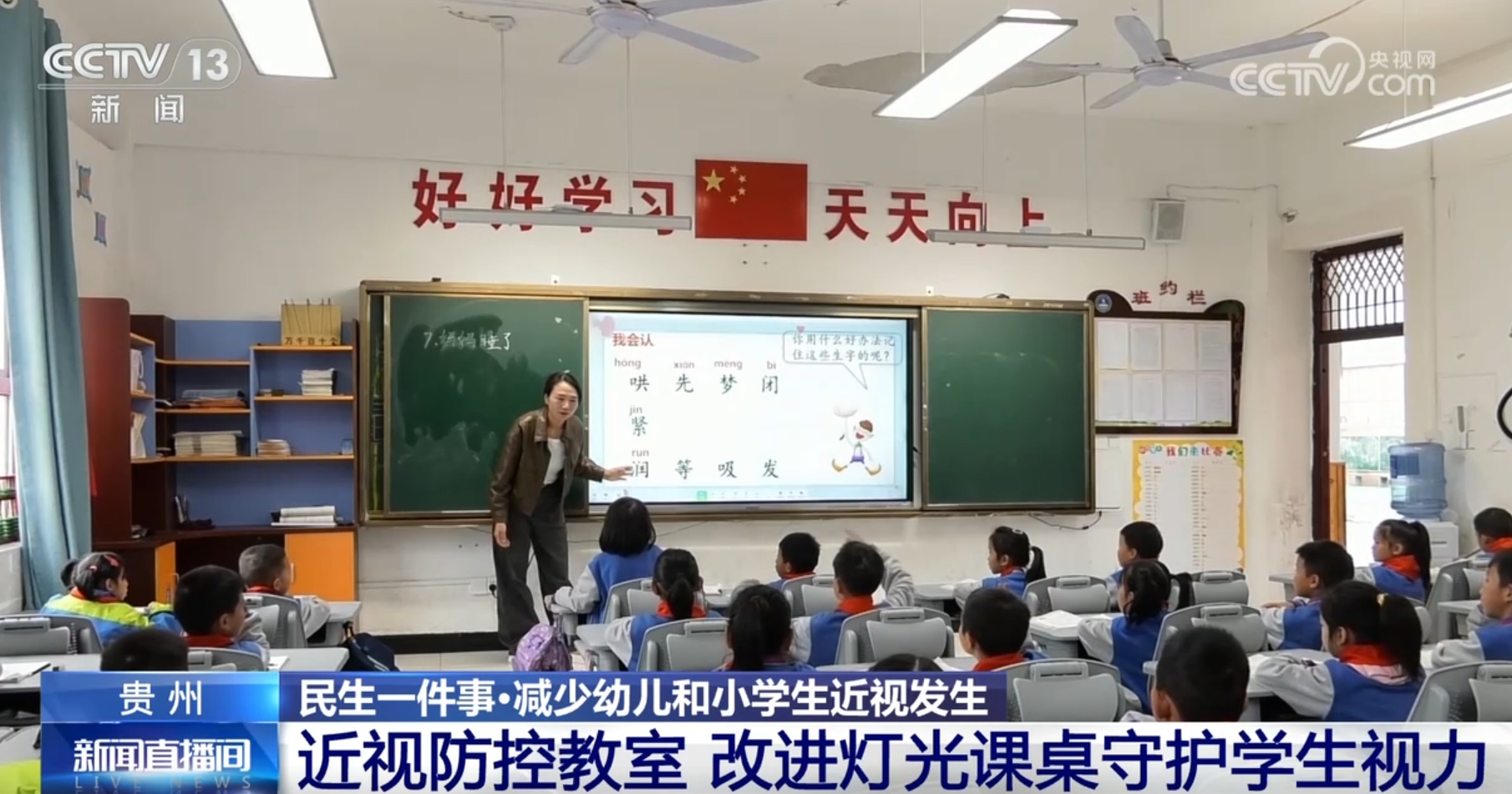 這是貴州桐梓縣文筆小學的“近視防控教室”,一盞盞近視防控日光燈呈現(xiàn)暖光狀態(tài),色溫接近自然光,能有效緩解眼睛疲勞。