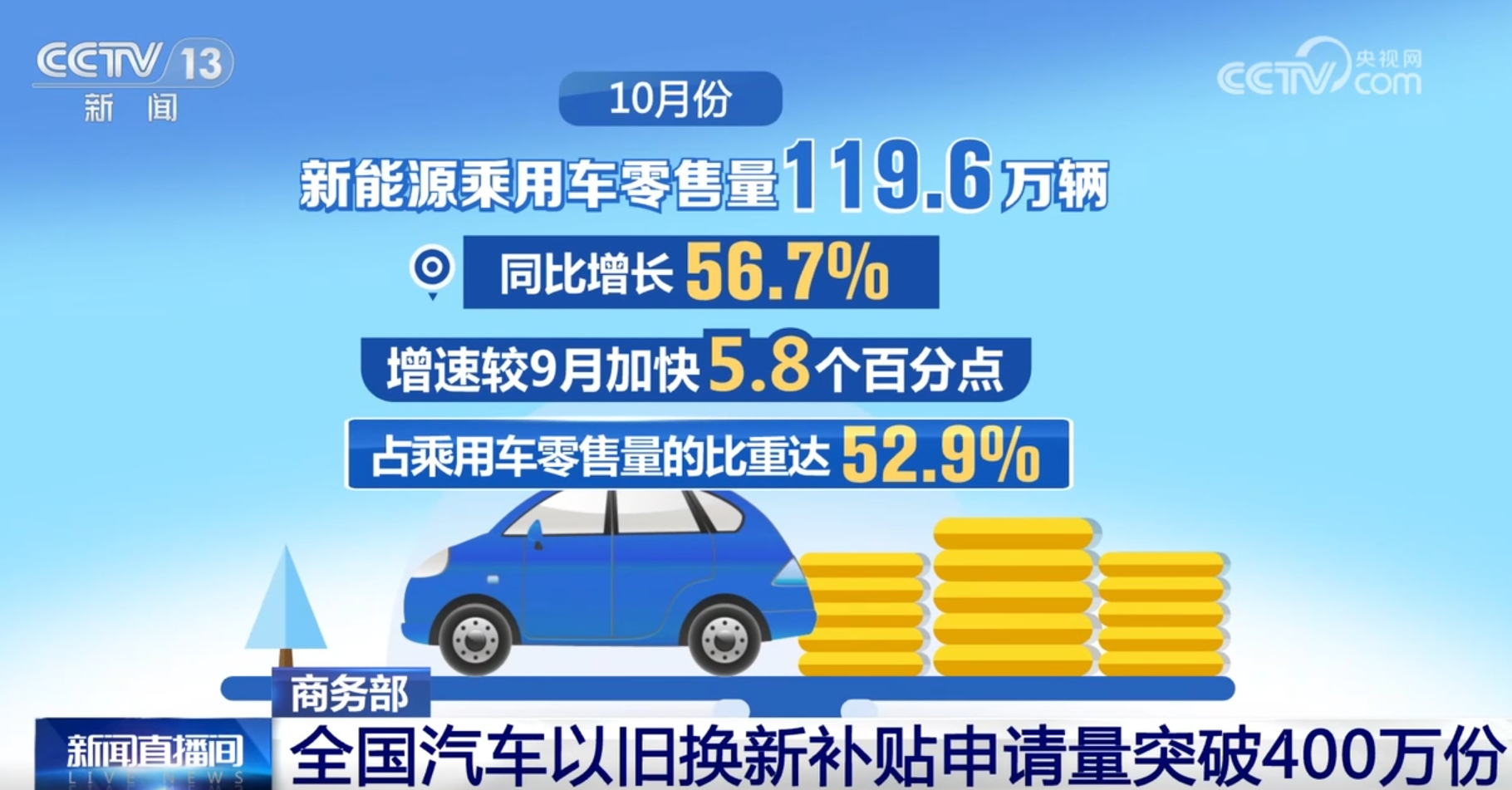 商務(wù)部數(shù)據(jù)顯示,截至11月18日24時(shí),全國汽車報(bào)廢更新和置換更新補(bǔ)貼申請均突破200萬份,兩者合計(jì)超過400萬份。
