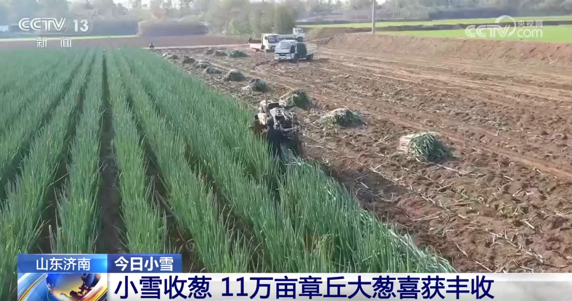 山東濟南:小雪收蔥 11萬畝章丘大蔥喜獲豐收