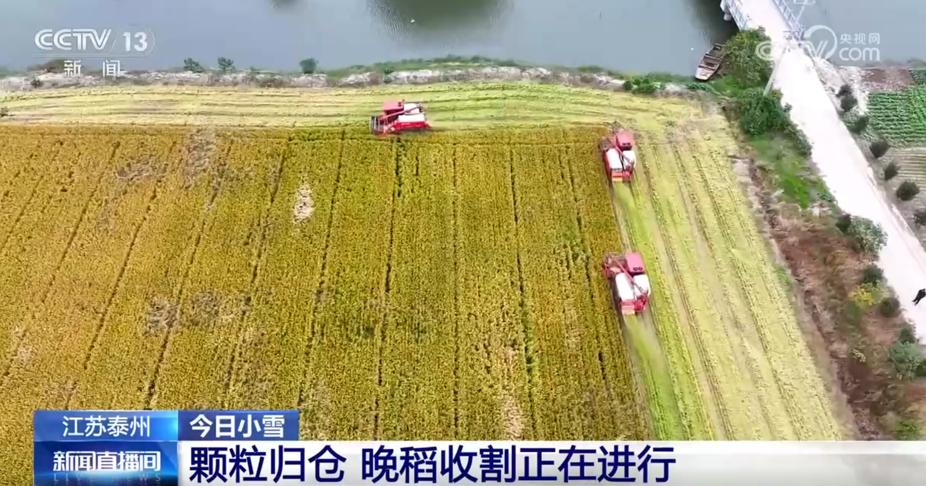 我們現(xiàn)在看到的是江蘇泰州正在進行的晚稻收割作業(yè)。這個時候,當?shù)卦绲竞椭械疽呀?jīng)收獲完成,收割機正開足馬力進行晚稻收獲,割穗、脫粒、粉碎秸稈,一氣呵成,連倒伏的稻穗也被采收干凈,金黃飽滿的稻谷順著管道傾瀉而下,顆粒歸倉。