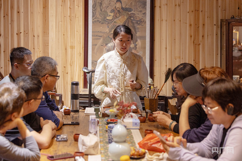 在倒扒獅街,“90后”安慶姑娘秦?zé)o顏是一家文化主題會(huì)館的主理人。在她的會(huì)館里,檀木、玉石等制作而成的新中式文玩飾品、傳統(tǒng)工藝面料制作而成的“新中式”服裝、古色古香的“新中式”茶館,定期舉行的雅集活動(dòng)……無(wú)一不體現(xiàn)著獨(dú)特的東方美學(xué)。2020年,在上海從事珠寶設(shè)計(jì)工作的她返回家鄉(xiāng)經(jīng)營(yíng)起這家文化空間?!凹戎鹦?,也尋根?!彼M腿藖?lái)到這里,放慢腳步,在交流與體驗(yàn)中感受傳統(tǒng)文化的魅力,豐富精神體驗(yàn)。
