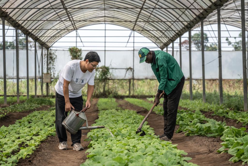 2024年8月3日,在剛果(布)首都布拉柴維爾的中國援剛果(布)農(nóng)業(yè)技術示范中心內,中方農(nóng)業(yè)專家李科明(左)與當?shù)貑T工在大棚內耕作。(新華社記者鄭揚子攝)