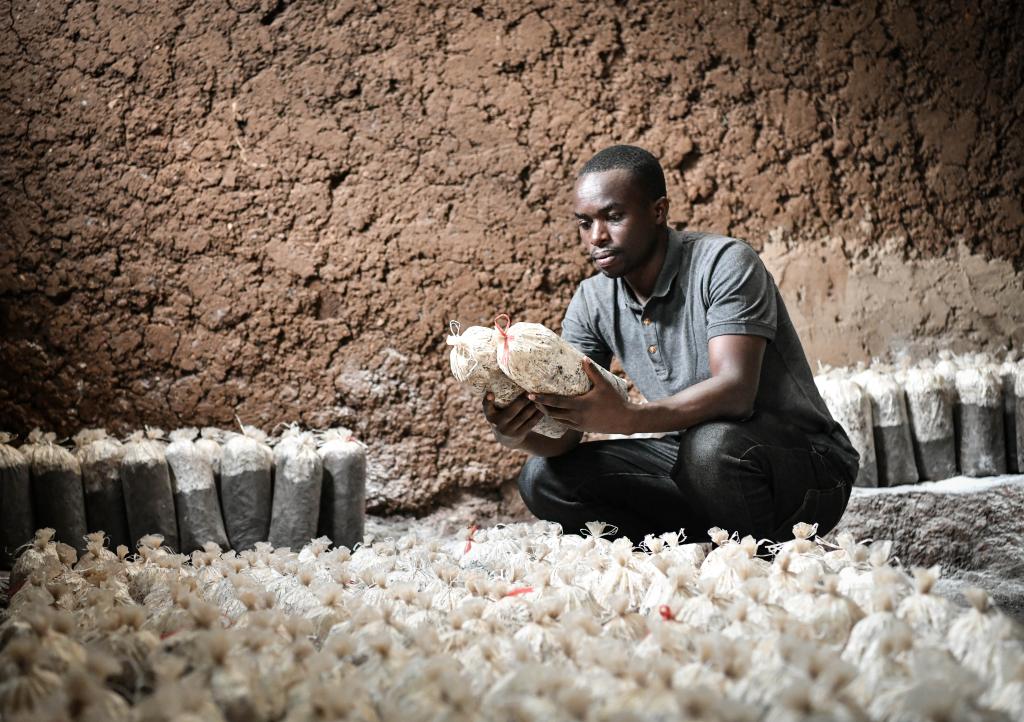 2024年8月14日,在盧旺達南方省穆漢加區(qū),尼揚博·奧貝德在食用菌培育工坊內檢查菌袋。曾兩次赴中國進行菌草技術培訓的尼揚博·奧貝德在南方省和東方省各擁有一家工坊。(新華社記者韓旭攝)