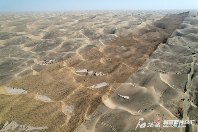 11月28日,俯瞰位于葉城縣洛克鄉(xiāng)國(guó)道北側(cè)鎖邊空白區(qū)連片的防沙網(wǎng)格。
