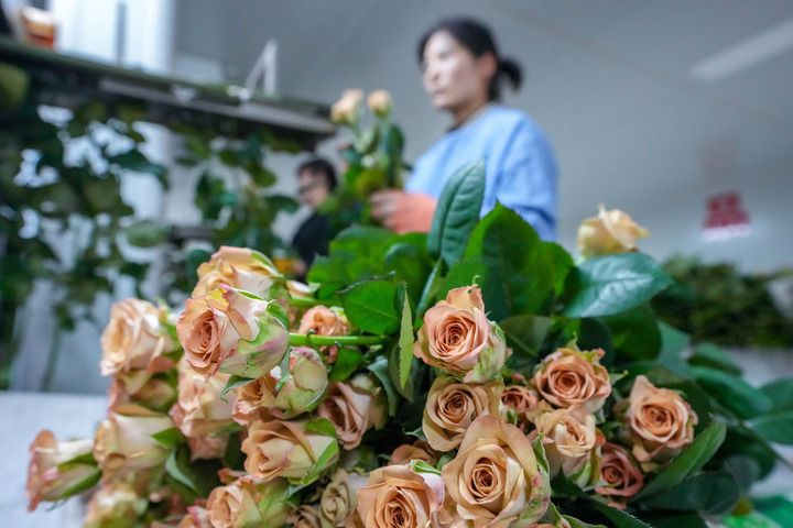 2024年8月23日,在云南晉寧花卉產業(yè)現(xiàn)代化示范園采后處理中心,花農將鮮切花放入自動分揀流水線上進行分揀。新華社記者 陳欣波 攝