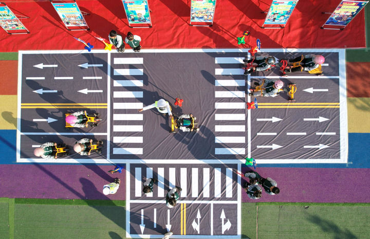 12月1日,在山東省臨沂市沂南縣雙堠鎮(zhèn)中心幼兒園,孩子們通過趣味游戲的方式學(xué)習(xí)交通知識(無人機(jī)照片)。新華社發(fā)(王彥冰攝)