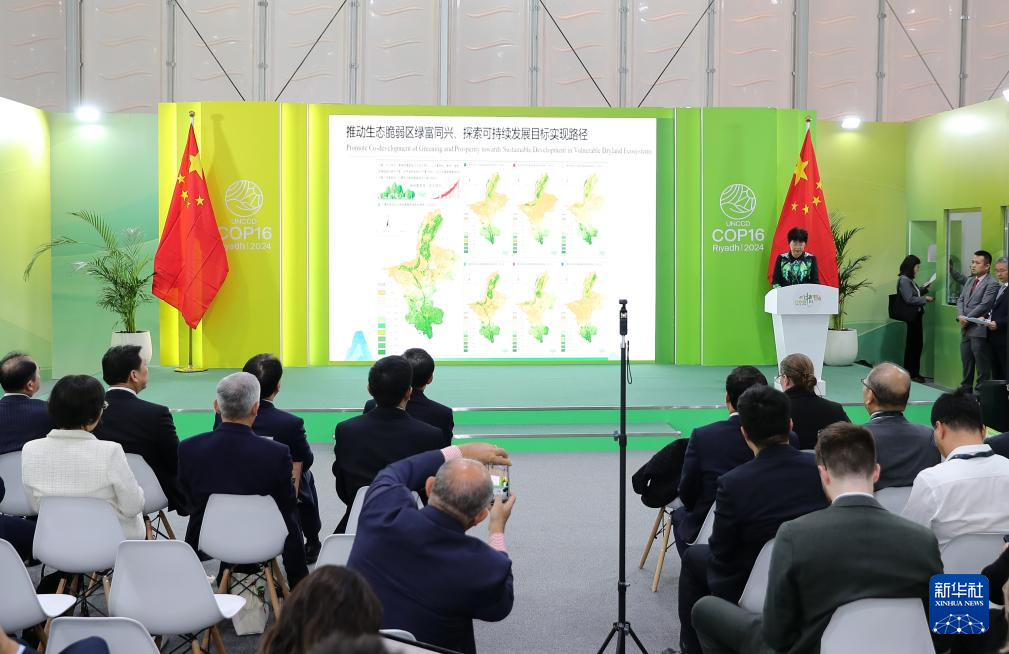 這是12月4日在沙特阿拉伯利雅得《聯(lián)合國防治荒漠化公約》第十六次締約方大會(huì)(COP16)中國館拍攝的邊會(huì)現(xiàn)場(chǎng)?!堵?lián)合國防治荒漠化公約》第十六次締約方大會(huì)(COP16)中國館4日下午舉辦首場(chǎng)邊會(huì),向全球介紹荒漠化防治的“寧夏經(jīng)驗(yàn)”。新華社記者 王東震 攝