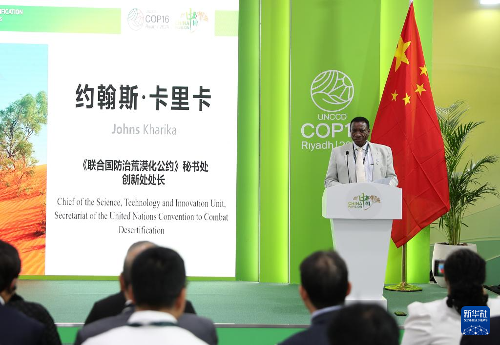 12月4日,在沙特阿拉伯利雅得《聯(lián)合國防治荒漠化公約》第十六次締約方大會(huì)(COP16)中國館,《公約》秘書處創(chuàng)新處處長(zhǎng)約翰斯·卡里卡在邊會(huì)上發(fā)言。新華社記者 王東震 攝