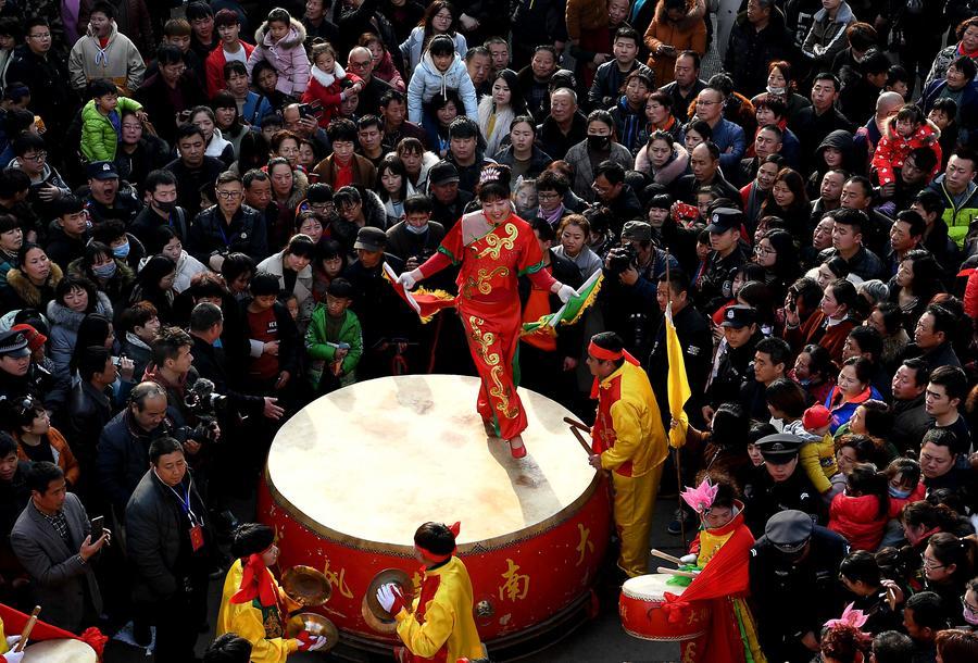 2018年3月2日,一支鑼鼓隊在河南浚縣古廟會上表演。 新華社記者 李安 攝