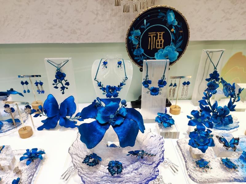 酉州苗繡非遺工坊的“藍(lán)色系列”首飾。中青報(bào)·中青網(wǎng)記者 蔣肖斌/攝