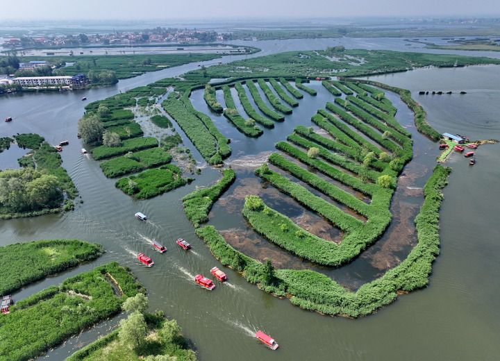 游船在河北雄安新區(qū)白洋淀內游覽(2024年5月8日攝,無人機照片)。