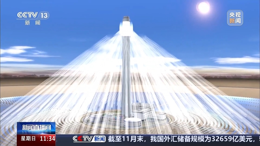 在戈壁荒漠中,這些“向日葵”如何能夠發(fā)電?其中有一個(gè)聳立的高塔,叫做吸熱塔。塔高達(dá)180米,相當(dāng)于一個(gè)60層高的住宅樓。塔內(nèi)管道里面裝的是熔鹽的液體,一共有兩萬一千多噸。這一萬多朵“向日葵”鏡子和這些熔鹽要在陽光的作用下發(fā)生一段奇妙的反應(yīng),最終產(chǎn)生電。而最為奇特的是,這些電并不僅僅是在白天產(chǎn)生,還可以在夜晚發(fā)出。