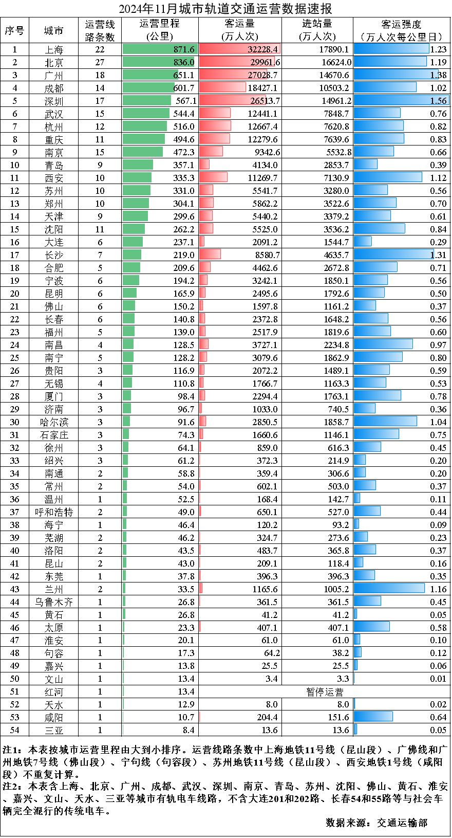 交通運(yùn)輸部發(fā)布消息,2024年11月,31個(gè)?。ㄗ灾螀^(qū)、直轄市)和新疆生產(chǎn)建設(shè)兵團(tuán)共有54個(gè)城市開(kāi)通運(yùn)營(yíng)城市軌道交通線(xiàn)路313條,運(yùn)營(yíng)里程10522.1公里,實(shí)際開(kāi)行列車(chē)340萬(wàn)列次,完成客運(yùn)量27.1億人次,進(jìn)站量16.2億人次。11月份,客運(yùn)量環(huán)比減少0.6億人次,降低2.2%,同比增加1.3億人次,增長(zhǎng)5.2%。11月份全國(guó)總運(yùn)營(yíng)里程的平均客運(yùn)強(qiáng)度為0.860萬(wàn)人次每公里日,環(huán)比增長(zhǎng)0.8%,同比增長(zhǎng)1.9%。
