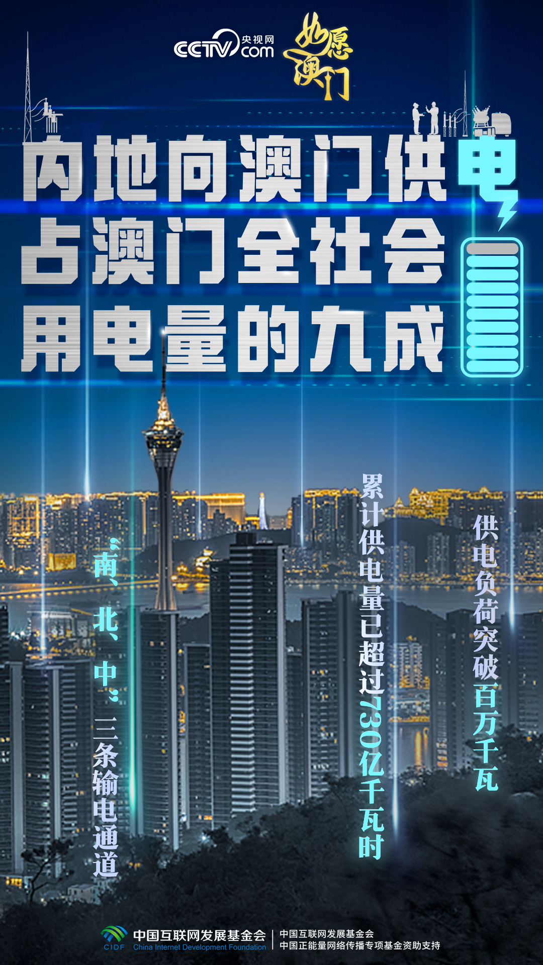 澳門缺電,南海油氣田里伸出專供澳門發(fā)電的天然氣管道,粵澳“南、北、中”三條輸電通道接續(xù)架設(shè),條條“銀線”相連,為澳門經(jīng)濟(jì)社會發(fā)展注入源源不斷的強(qiáng)勁動能。1999年回歸當(dāng)年,內(nèi)地對澳供電量為1.95億千瓦時;2024年7月,內(nèi)地向澳門供電負(fù)荷突破百萬千瓦,累計供電量已超過730億千瓦時。