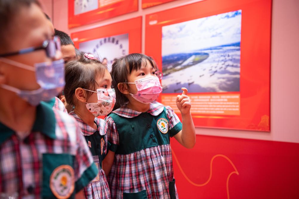 2021年7月12日,小朋友參觀在澳門(mén)舉行的“中國(guó)共產(chǎn)黨的100年”大型圖片展。新華社記者 張金加 攝
