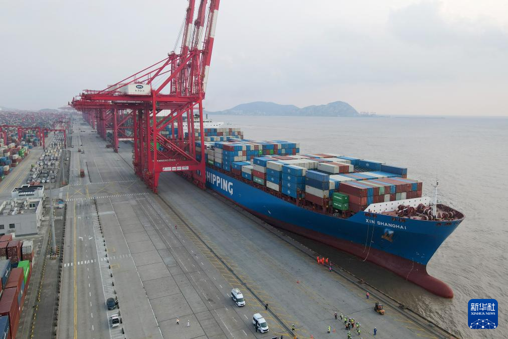 12月18日,“新上海”輪靠泊上海洋山港碼頭(無人機照片)。新華社記者 方喆 攝
