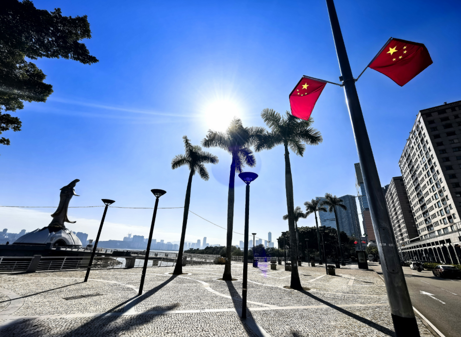 12月18日,澳門街頭隨處可見(jiàn)慶祝澳門回歸祖國(guó)25周年的元素,國(guó)旗及特區(qū)區(qū)旗隨風(fēng)飄揚(yáng)。(海外網(wǎng) 牛寧 攝)