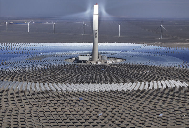 這是2024年9月12日在新疆哈密市伊吾縣淖毛湖鎮(zhèn)拍攝的國家光熱示范項目——熔鹽塔式50兆瓦光熱發(fā)電站(無人機照片)?! ⌒氯A社記者 胡虎虎 攝