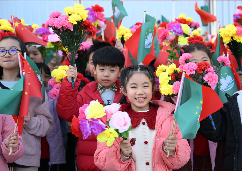 在澳門國際機(jī)場,澳門警察樂隊(duì)奏響熱情洋溢的歡迎曲,舞龍舞獅表演喜氣歡騰。數(shù)百名澳門青少年和各界群眾代表揮動(dòng)國旗、特別行政區(qū)區(qū)旗和鮮花,表達(dá)熱烈的歡迎。